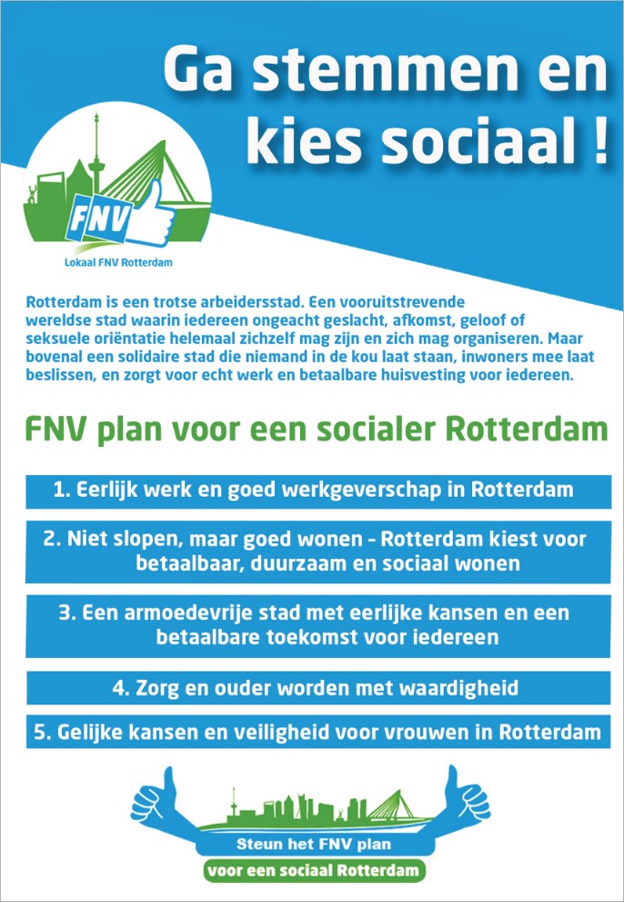 Op donderdag 19 juni hebben wij namens lokaal FNV Rotterdam het FNV-plan voor de gemeenteraadsverkiezingen 2026 aangeboden aan de politieke partijen binnen de gemeenteraad van Rotterdam.