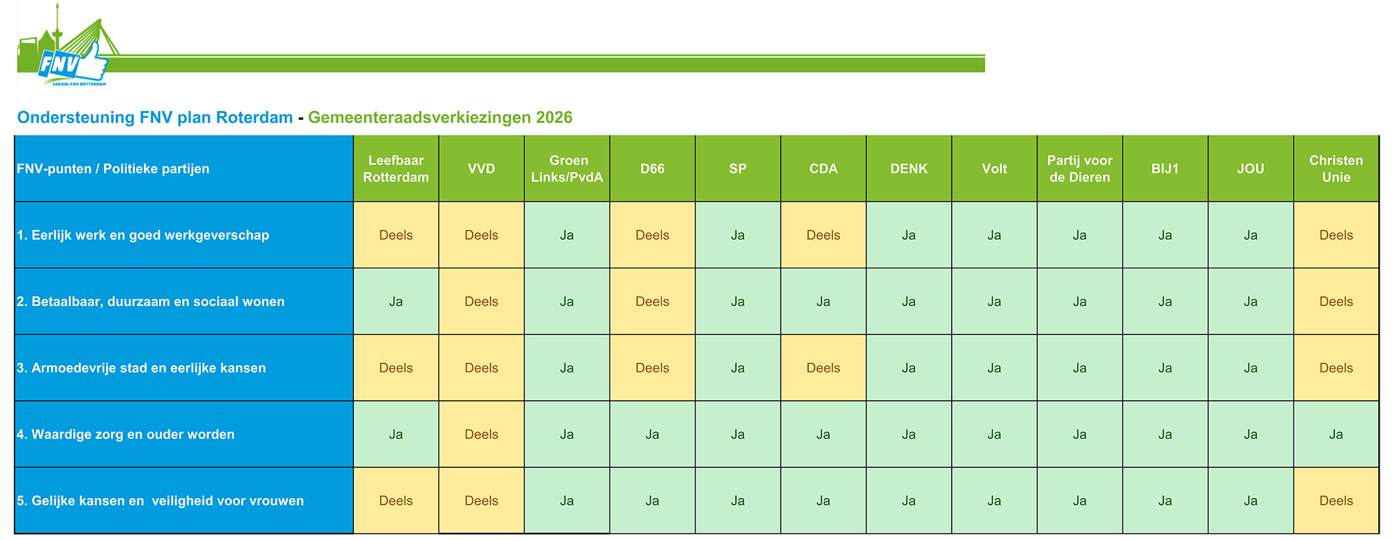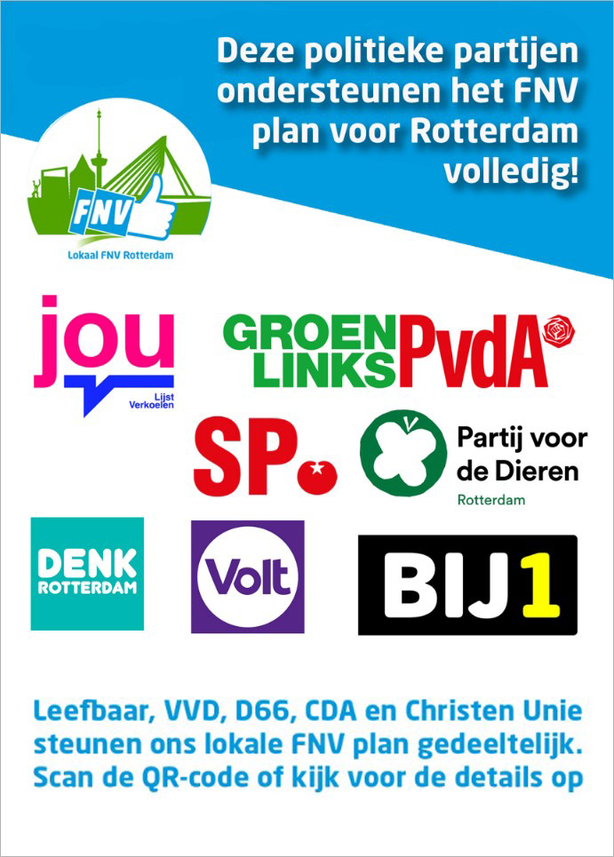 Op donderdag 19 juni hebben wij namens lokaal FNV Rotterdam het FNV-plan voor de gemeenteraadsverkiezingen 2026 aangeboden aan de politieke partijen binnen de gemeenteraad van Rotterdam.